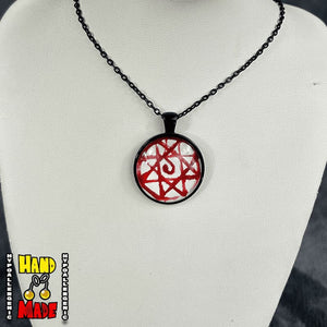 The Crimson Alchemy Sigil Anime Necklace draws inspiration from the powerful blood rune imagery seen in Fullmetal Alchemist. This Anime Necklace features a bold sigil design that represents sacrifice, loyalty, and the unbreakable bond between brothers. The deep red symbol stands out against a clean metal setting, creating a striking piece that feels meaningful without being overwhelming.
